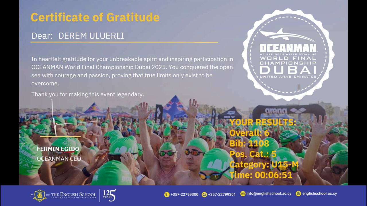 We are delighted to celebrate an outstanding achievement by our student Derem Uluerli, who represented himself and our school with determination and courage at the OCEANMAN World Final Championship, Dubai 2025 (United Arab Emirates).
