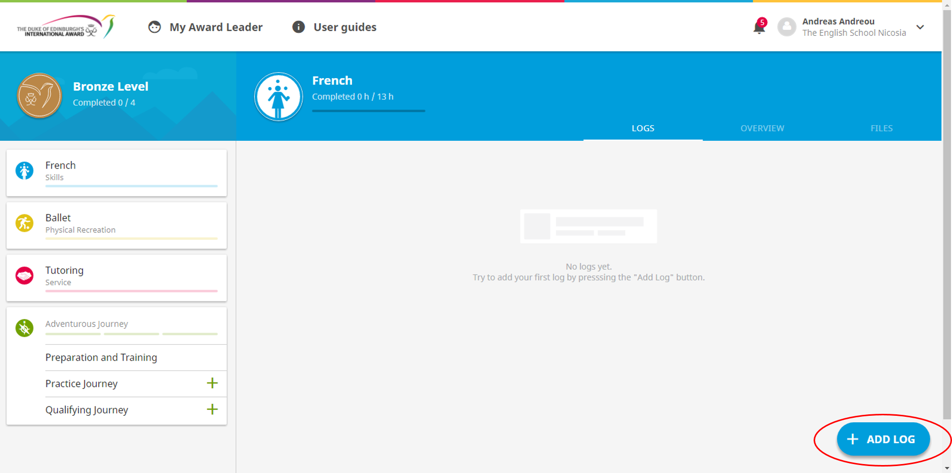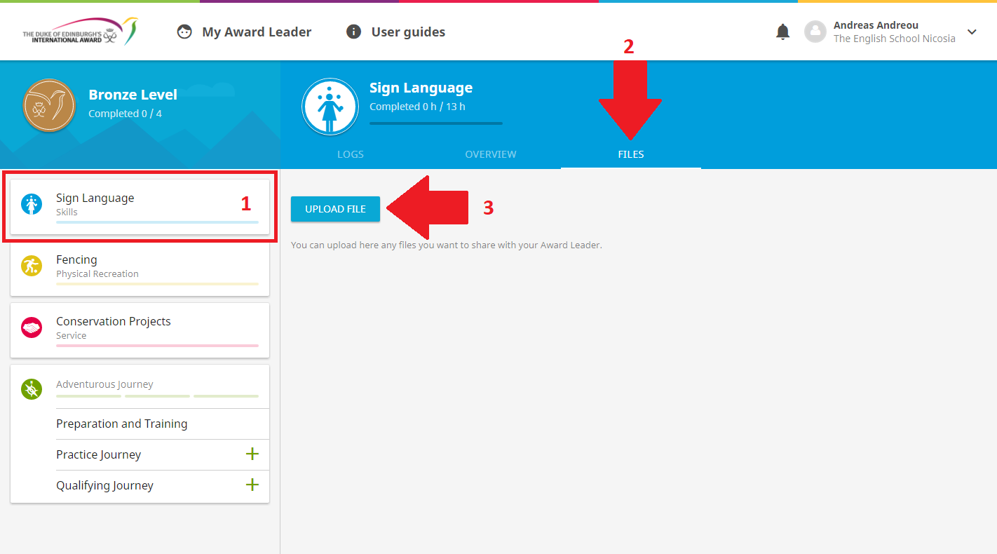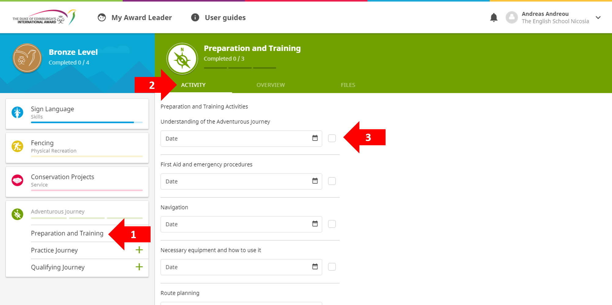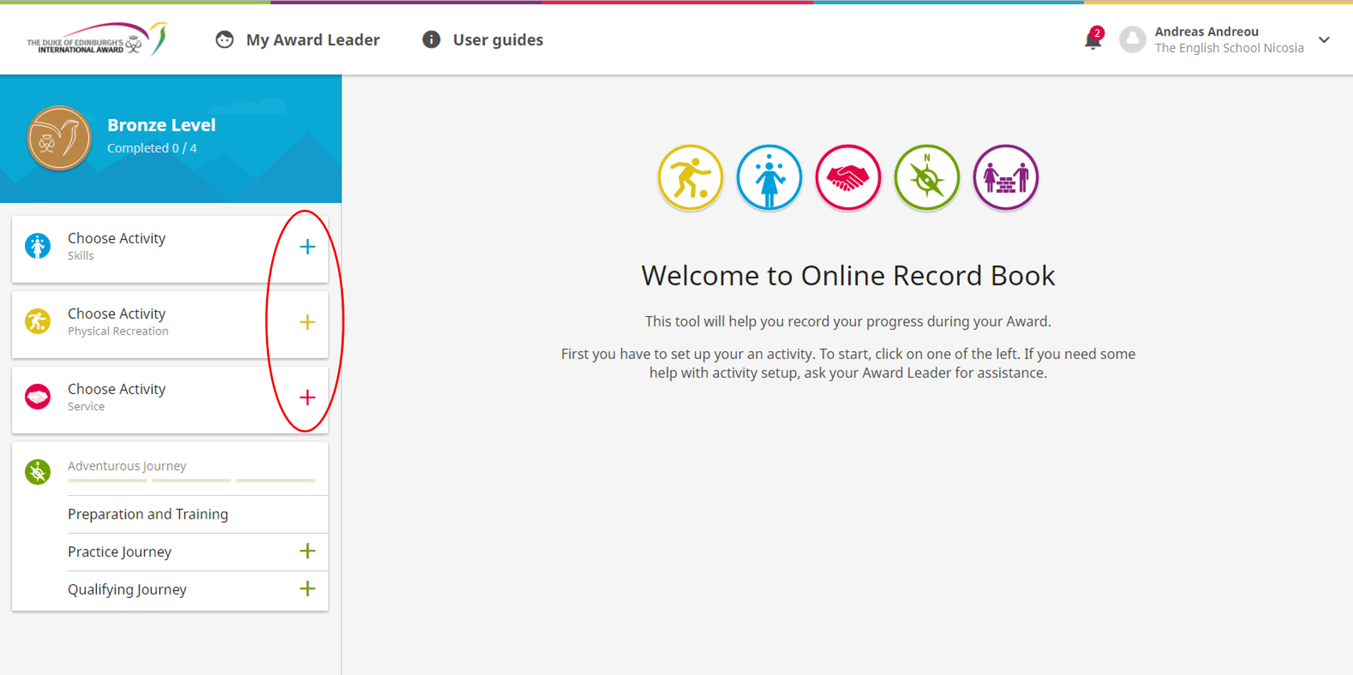 a. Click on the + sign next to each of the 3 Sections (Physical Recreation, Skills & Voluntary Service) to navigate to the “New Activity” page where you will be able to add the details of your activity.