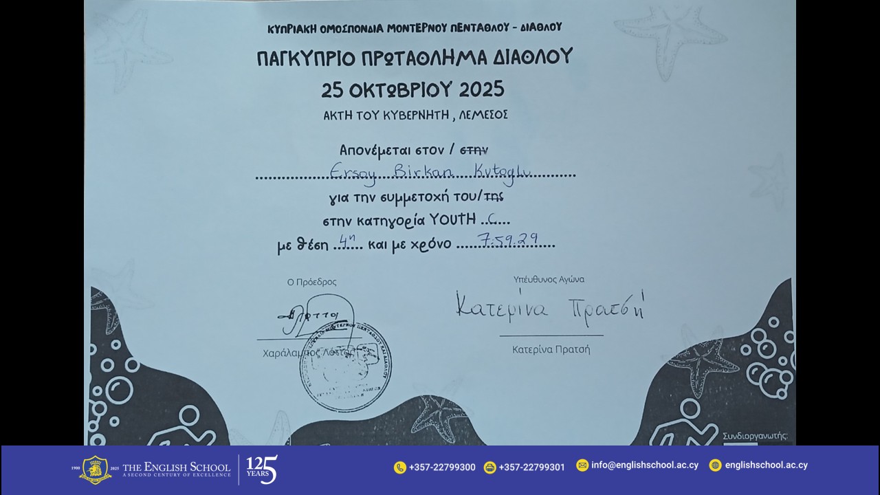 Year 3 student Ersoy Birkan Kutoglu proudly represented The English School in the Pancyprian Biathlon Competition, organised by the Cyprus Modern Pentathlon Biathlon Federation at Governor’s Beach.